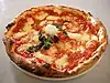 | pizza | A dish of flat dough topped with tomato sauce, cheese, and other toppings, originating in Italy. cuisine=italian_pizza is used ins about 3% of the total and should be substituted by a multiple value set (like cuisine=pizza;italian) for the cases that the culinary speciality is Italian.