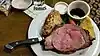 | steak | A thick cut of beef, usually grilled. See also: cuisine=steak_house.