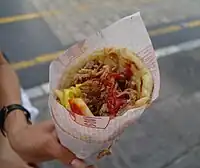 | shawarma | A meat dish cooked on a vertical rotisserie, originating in the Middle East | ![]() | |
