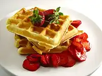 | waffle | A batter cooked between two shaped plates, often eaten as breakfast or dessert | ![]() | |