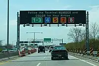 - ↑ At this airport, exit signs have the same background color as the destination terminal, but through lanes' signs have the standard green background of any destination sign. The signs' background colors matter less than the destinations' color swatches.