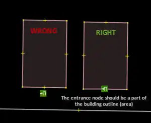 - For the main entrance to areas/points of interests (POIs) with multiple entrances (even multiple main entrances), use a Relation:site and add