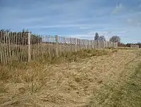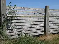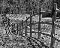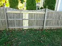 A fence made of wooden or concrete upright posts, with usually three horizontal wooden rails, to which vertical wooden boards are fastened. | |