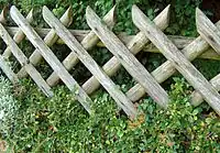 A variety of fences, usually consisting of either vertical posts tied together with wire, or vertical boards nailed to horizontal braces. |