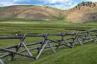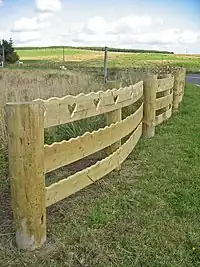 A variety of fences usually made of horizontal rails on top of vertical, or sometimes slanted, posts. |