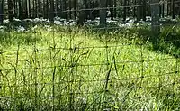 A fence mainly made of wire, in a variety of styles; e.g. welded vertical wires, horizontal wires strung through / between posts, wire mesh. | ![]()