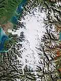 Ice masses significantly covering underlying topography but constrained by mountains (in contrast to ice caps which lie on top of them), see Wikipedia | The Southern Patagonian Ice Field |
