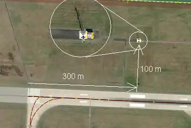 The antenna can be found about 300 m from the beginning of the runway to the left or to the right 100 m to the side