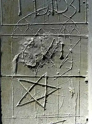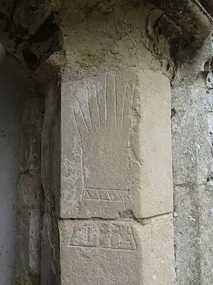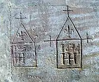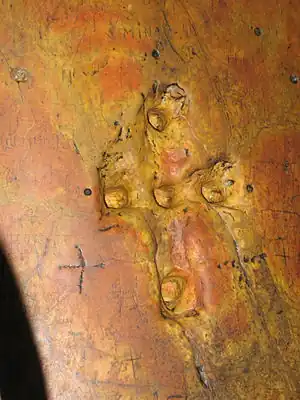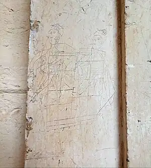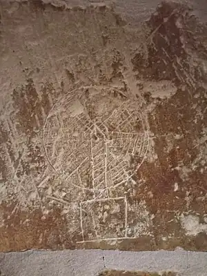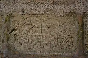 | ship | One or more boats or ships are etched into the wall, sometimes interpreted as having been left by pilgrims after surviving a shipwreck. | ![]() |