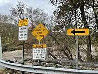 A bridge with sign only allowing 1 vehicle at a time. |