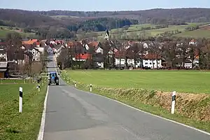 A narrow two-way road without marked lanes and with an estimated width of four metres. It is not qualifying for tagging as road with two lanes as there is not enough space for vehicles to comfortably pass each other. |