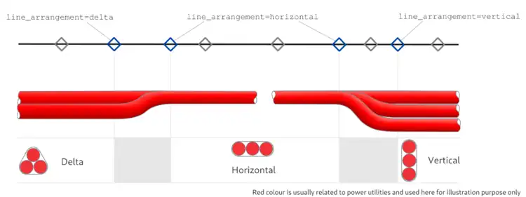 Then, it is optional to use line_arrangement=* on any node and recommended on node where arrangement is changing along cables' path. Arrangements can change near of particular way points: when going through a bridge, a delta arranged cable can punctually be horizontally arranged to fit in the bridge for instance.