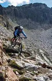 Mostly stable, unsurfaced, partly washed out, steady pedalling and balance needed. With good technique and reasonable fitness this should be still doable however. | <20% | <25% | Fistsize loose rocks, roots or rocky underground |