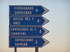 In Friuli Venezia Giulia many places and geographical features (rivers, mountains...) have a toponym in Friulian. These names should be added as name:fur=*. In some villages the names of the roads are both in Italian and Friulian so you should add them in the same way. In certain cases there are two version of the toponym, one in standard Friulian and one in the local form/variant; you should add the local form too using loc_name:fur=* tag.