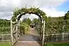 Open gate at an orchard. The gate is always fully open, so maxwidth:physical=* is sufficient.