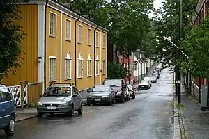 Sometimes the parking on the street is allowed at the edge of the driving lane, at other times there is a painted, dedicated strip at the edge of the road, and sometimes one must park on the high side of the kerb stone.