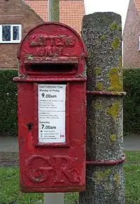 | waggon_top | A small rectangular cast iron lamp box with slightly convex top with royal cypher above the slot and "letters only" below slot. Normally attached to post or pole, occasionally attached to wall. |