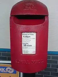 | ludlow | Wall box built into stone pillars or the walls of buildings and are never found free-standing. This is because they are made largely from wood. Has distinctive large white panel with royal cypher and "Post Office Letter Box" (sometimes with instructions on what not to post). |
