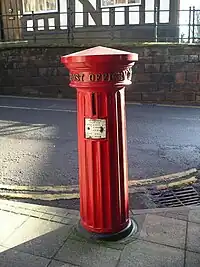 | liverpool_special | Liverpool "special" post box are pillar boxes originating from 1863, when cast by Messrs Cochrane and Company of Dudley. They follow a similar form to the pillar post box, but exhibit a crown on top of them, as well as the words "POST OFFICE" in golden capitals. |