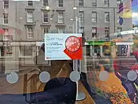 A shop with a sign on the door advertising a weekly quiet hours period during which the overhead speakers are turned off: