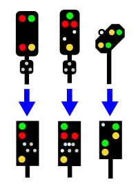 In some cases, the railway:signal:main:shape tag may be complemented with a railway:signal:main:type tag to accurately describe the layout of the signal and its lights.