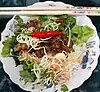 | banh_hoi | A Vietnamese dish of rice vermicelli woven into bundles, topped with scallion oil, and served with grilled meat. | ||