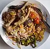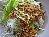 | meeshay | Burmese rice noodle dish with meat sauce, derived from Chinese mixian and developed by the Shan people. Variants include Mogok, Mandalay, and claypot styles. | ![]() | |