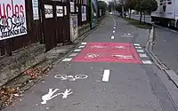 Colored road surface on a foot- and bike path, intended as a warning indicator on a crossing.