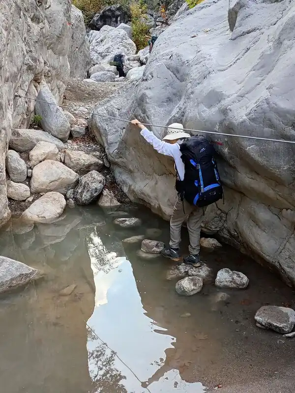In a poll, 9 out of 15 voted this picture shows demanding_mountain_hiking while 5 considered it mountain_hiking and 1 alpine_hiking. Obstacles can be classified as either smaller rocks or boulders. Some see exposure, some argue that thanks to the option of easy safe fording, there is no exposure. Use of hands while not fording potentially needed for balance, but not for advance (no strength needs to be exerted from the arms). Rope is used to make (for some) exposed areas more secure. Most likely do not see continuous trail.