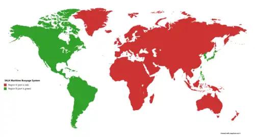 There are two international buoyage regions, A and B, between which lateral marks differ. The buoyage region is encoded using the separate attribute "system" (MARSYS). Lateral buoys generally have distinctive shapes (can for port-hand, conical for starboard-hand) or may be a pillar or spar with distinctive topmarks. The buoys and their topmarks are always painted in red, green or red & green horizontal bands.