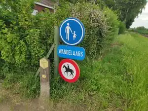 See picture above. In this case, the hiking route is signposted with hexagonal shields. If you came from the other side, no sign or trailmarker would be visible.