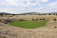 A sinkhole clogged up, sometimes only partly, with earth or debris, and which, when filled, generally looks like an old crater with flat, fertile ground; when fully clogged up, it often contains a pond from trapped rainwater, no longer able to escape by the clogged bottom; when only partly clogged up, the pit still reaches the surface; a doline can form around an estavelle, a ponor, a karst spring or a blue hole. This is one of the sinkholes a polje can contain. |