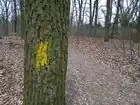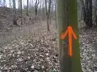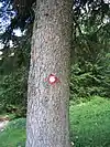 Trail marking made by colorful symbols painted directly on other objects like trees, stones, houses and so on. |