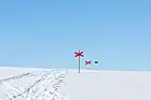 Trail marking made by erected poles wooden or plastic, colored or natural. If poles for example having red crosses on top for better vissibility |