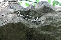 anchor / abseil | Usually multiple bolts connected by chain designed for rappeling/descent. |