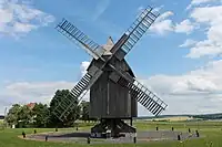 The distinctive feature of a post mill is that the whole body of the mill that houses the machinery is mounted on a single vertical post, around which it can be turned to bring the sails into the wind. |