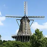 The smock mill is a type of windmill that consists of a sloping, horizontally weatherboarded, thatched, or shingled tower, usually with six or eight sides. It is topped with a roof or cap that rotates to bring the sails into the wind. |
