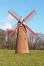 A tower mill is a type of vertical windmill consisting of a brick or stone tower, on which sits a wooden 'cap' or roof, which can rotate to bring the sails into the wind. |