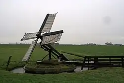 The tjasker is a distinctive small type of Frisian windmill which is also found in other Dutch provinces and in north Germany. It consists of an inclined wooden millshaft supported on a wooden frame, on the lower end it carries the Archimedean screw which is partially submerged in water. |