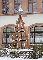 Christmas pyramids are Christmas decorations that have their roots in the folklore and customs of the Ore Mountain region of Germany, but which have become popular internationally. They comprise a decorated pyramidal outer frame with candle holders and a central carousel with a rotor at the top which is driven by warm air from the lit candles. The carousel is decorated with nativity scenes and other Christmas figures such as angels and wise men, as well as worldly motifs such as mining folk and forest scenes.