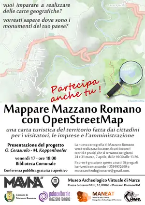 Nel marzo 2017 viene realizzato un workshop didattico per imparare ad usare OSM tramite il progetto di mappatura del borgo medievale di Mazzano Romano. L'iniziativa, gratuita e aperta a tutti, si svolge in cooperazione con il Museo Archeologico Virtuale di Narce e l'amministrazione comunale.