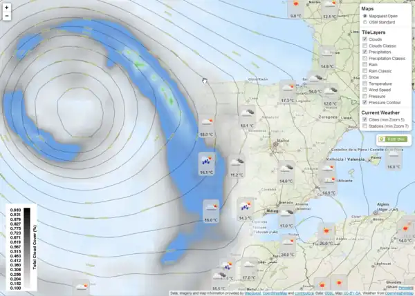 OpenWeatherMap (OWM) is a service providing weather related data, visualizing it using an OpenLayers based map. A Leaflet library is available but is it is very limited and uses an old API.