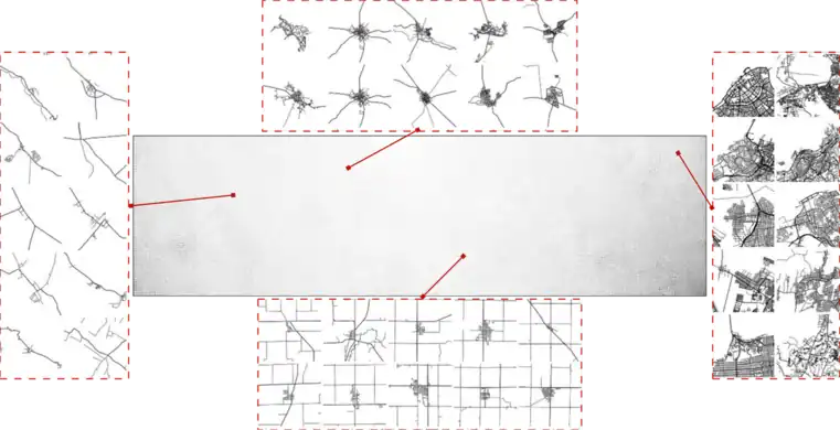An automatically generated spectrum of urban development patterns for around 1 million cities, towns and villages across the planet. Image from Vahid Moosavi's paper “Urban morphology meets deep learning” (PDF).