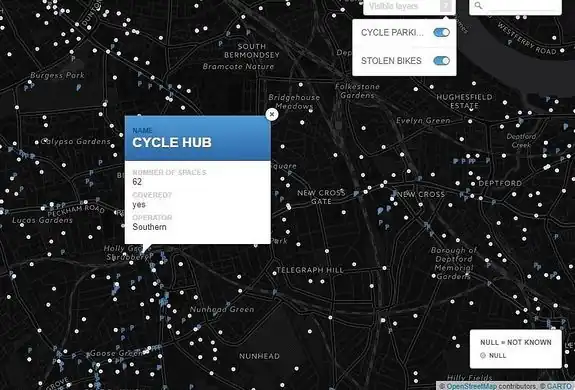 A map made by Stolen Ride shows every London cycle parking location mapped on OpenStreetMap and an optional layer of police data with the places of reported stolen bikes.
