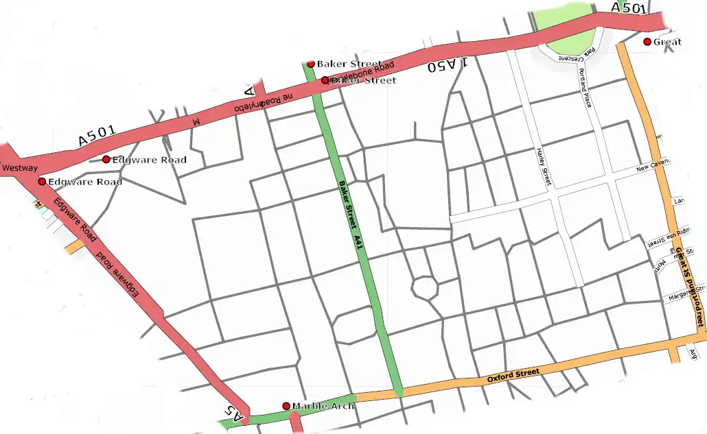 Edgeware Road, to Great Portland Street | The half to the east of Baker Street is complete and fully tagged, with the exception of a few Mews which don't have name tags. The block of streets immediately to the north of Oxford street could do with double checking for completeness 80n. |
