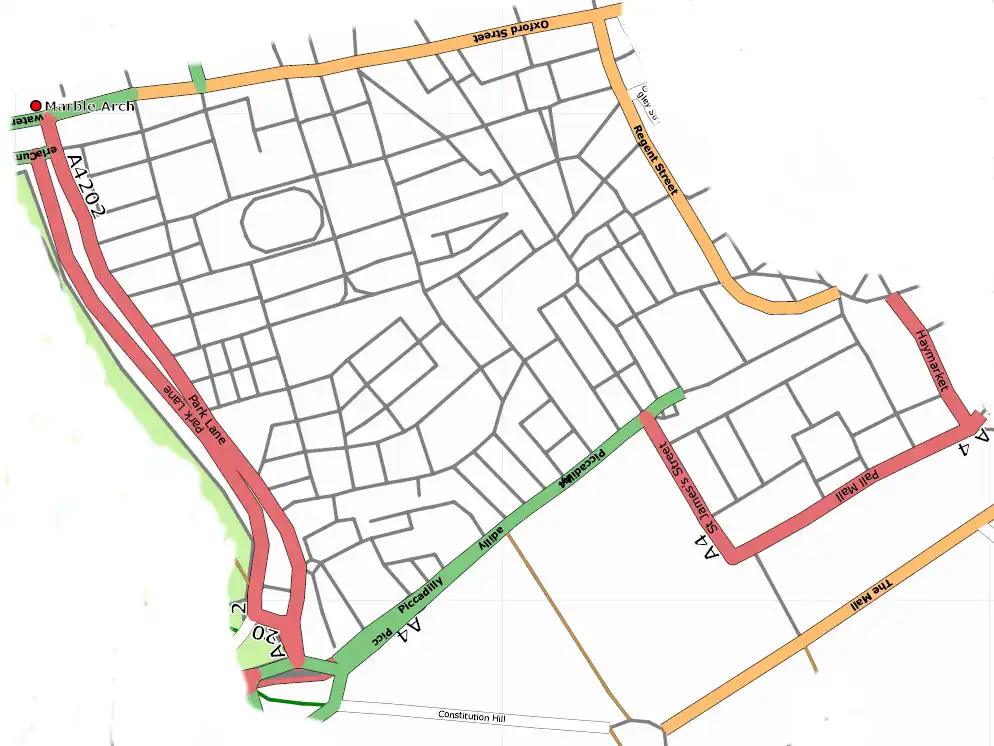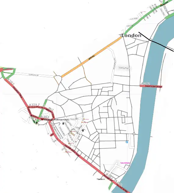 Pall Mall south to the river (and north of Pimlico) | User:Mikel 99.99%. Detail within St James Park left for others for later. |