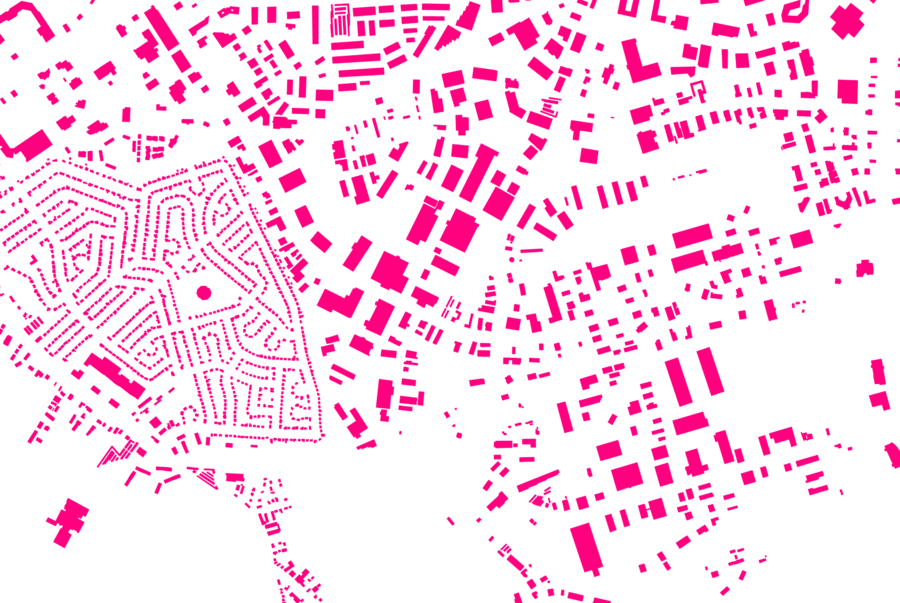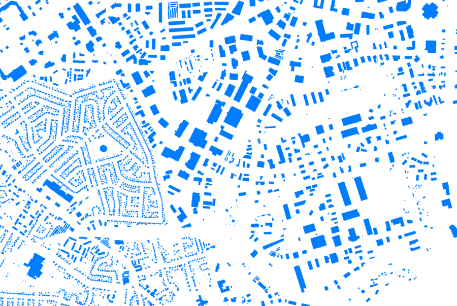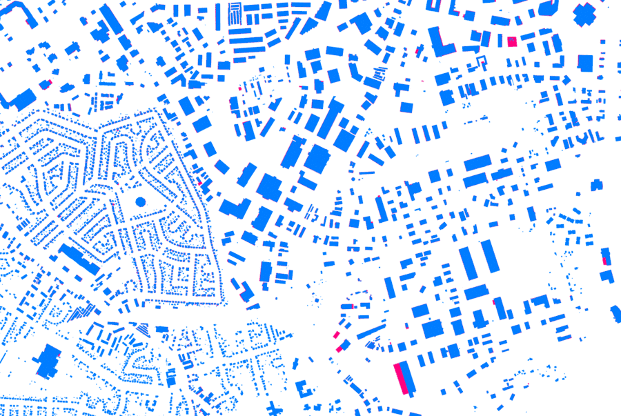 Some example details of building data overlap from user contributions (red) and GIS data to import (blue).