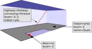 level=*avec les valeurs de niveaux de départ et d'arrivée, par exemplelevel=0;-1pour un escalier partant du rez-de-chaussée jusqu'au premier niveau de sous-sol.indoor=yespour indiquer qu'il s'agit d'éléments d'intérieur.- Et bien sûr les tags les caractérisant (voir ci-dessous pour les escaliers, escalators, ...).
