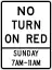 | R10-H11f | No Turn on Red / (hours/days) (all on one plate) | type=restriction restriction:conditional=no_right_turn @ (Su 07:00-11:00) or restriction:conditional=no_left_turn @ (Su 07:00-11:00)
