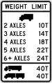 | R12-H6 | Weight Limit | maxweight=10 stmaxweight:hgv:conditional=10 st @ (axles=2); 14 st @ (axles=3); 18 st @ (axles=4); 22 st @ (axles=5); 24 st @ (axles>=6); 40 st @ (trailer)maxweight:hgv_articulated=40 st